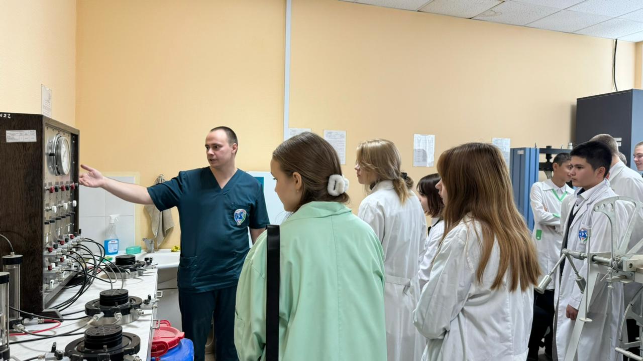 Школьников познакомили с процессом подготовки проб к анализу, продемонстрировали процесс титрования пробы воды для определения жесткости, процедурой биотестирования, а также с оборудованием строительной лаборатории и методикой определения степени растяжения геосинтетических материалов.