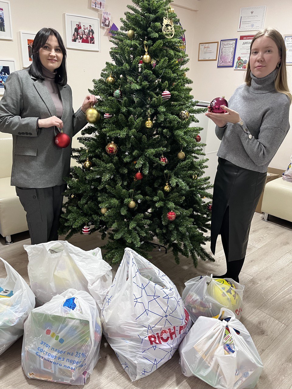 Сотрудники фонда с большой благодарностью приняли подарки и вручили филиалу брендированные новогодние шары, которые займут достойное место на новогодней елке.