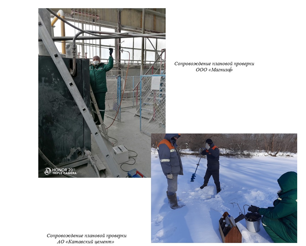 по Челябинской области выполнено аналитическое сопровождение плановых проверок ООО «Магниза», АО «Катавский цемент». Объектами контроля являлись промышленные выбросы, сточная и природная вода. По объекту контроля — природная и сточная вода проведен 3-х разовый отбор проб для расчета ущерба.