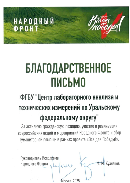 ФГБУ «ЦЛАТИ по УФО» отметили благодарственным письмом за весомый вклад в работу движения. Учреждение с 2022 года регулярно осуществляет передачу медикаментов, необходимых инструментов и гуманитарной помощи, а также пожертвование автомобилей для нужд фронта.