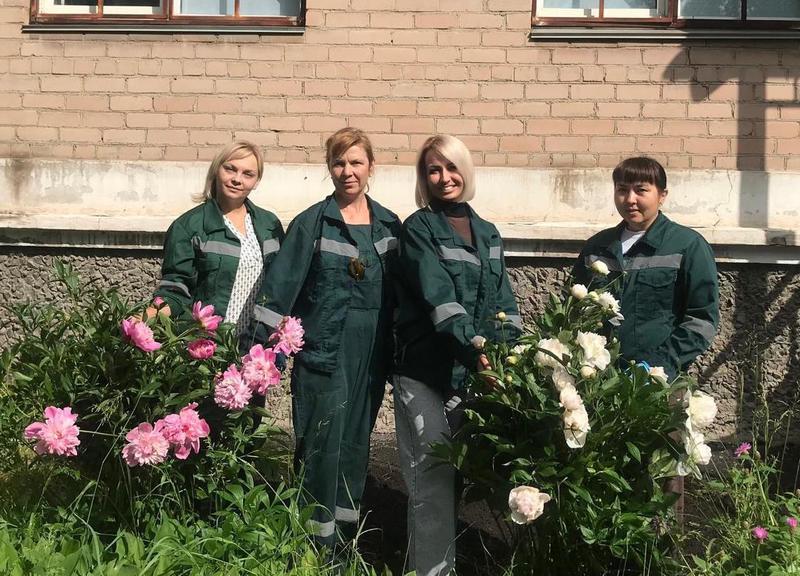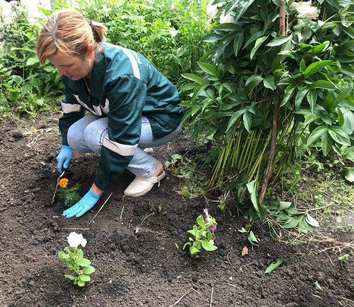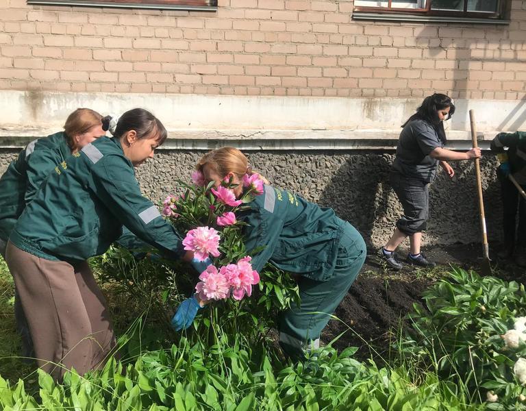 Проведена очистка клумб, обрезка многолетних кустов пышных и ароматных пионов, а также высажены цветы петунии и оранжевые бархатцы. Яркие краски цветов, бесспорно, создали уютную атмосферу. Теперь они будут радовать глаз и поднимать настроение сотрудников и посетителей.