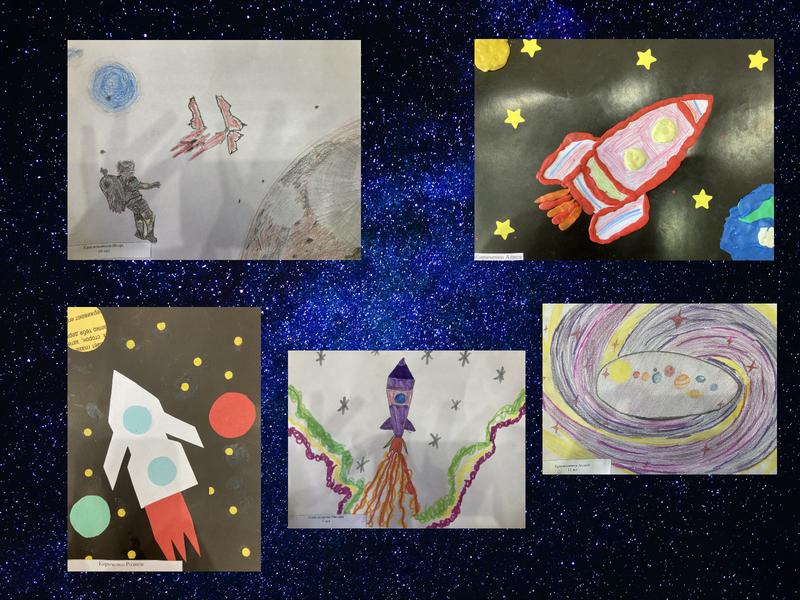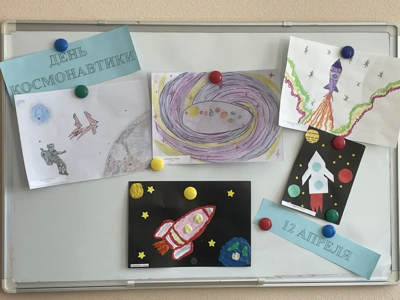 В честь события по инициативе Молодёжного совета в филиале организовали выставку детских рисунков и поделок, посвящённых космосу. Ребята изобразили ракеты, планеты, звёзды и Юрия Гагарина.